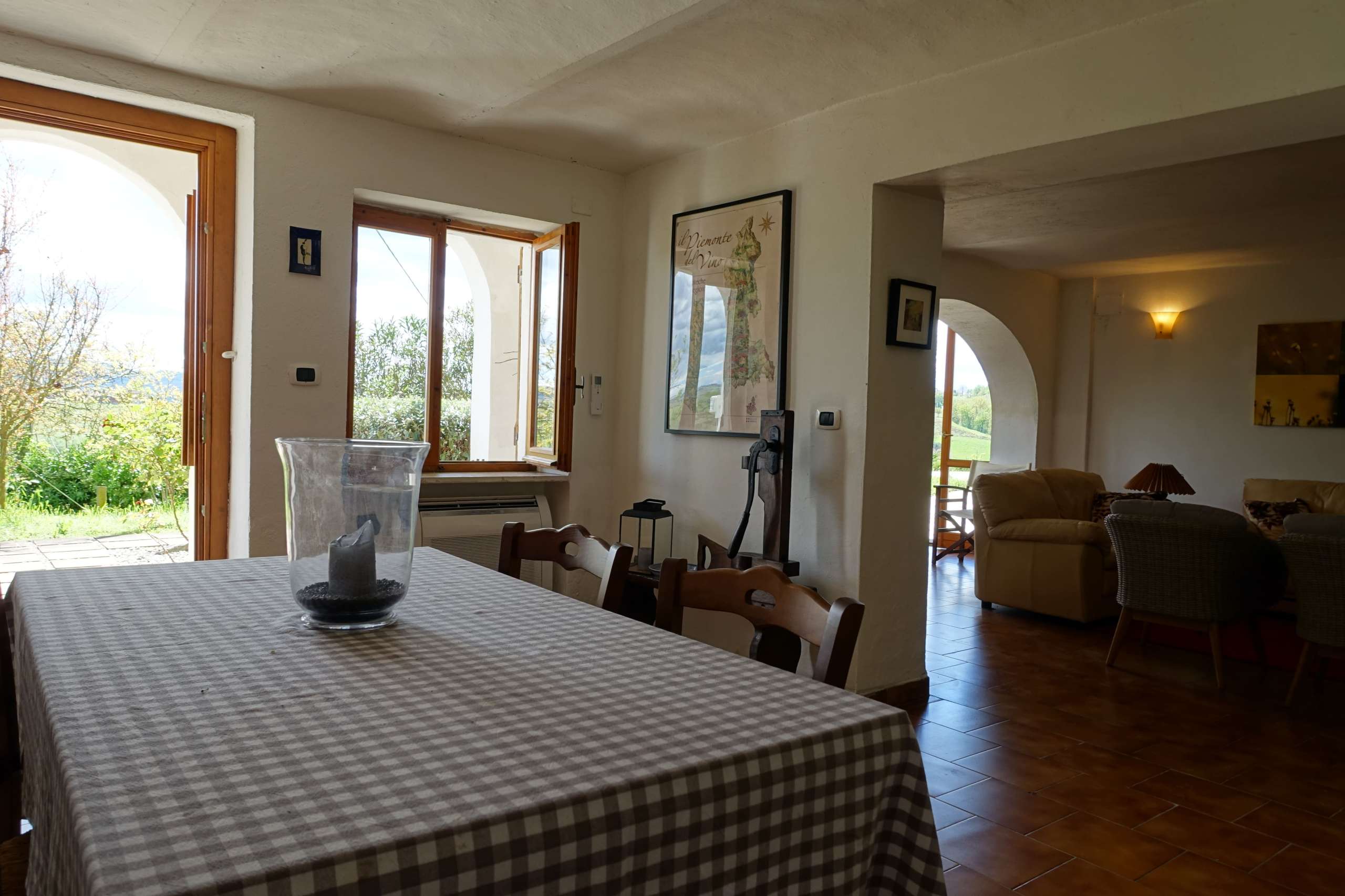 On the south side of the residence, a charming whitewashed arcade with cement beams adds a touch of rustic elegance. Thoughtfully adorned with local elements—including vintage damigiane and antique wine barrels—this inviting space is ideal for unwinding in the afternoon light, savoring a glass of Barbera while soaking in the serene hillside landscape.