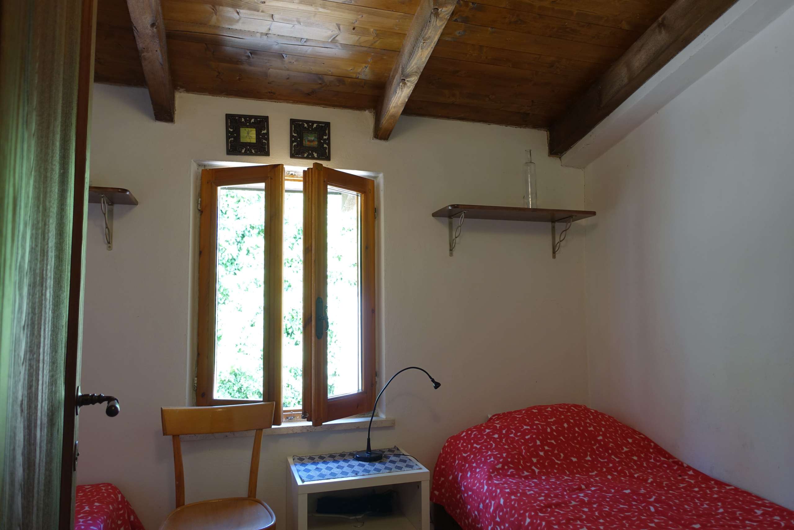 Ascending to the upper level, the home’s charming rustic details truly shine: exposed wooden beams, built-in niches, and handcrafted wooden furnishings—hallmarks of traditional Piemontese cascine—infuse the space with warmth and authenticity. The serene sleeping quarters offer both comfort and character, while a modern, well-appointed bathroom ensures contemporary convenience.