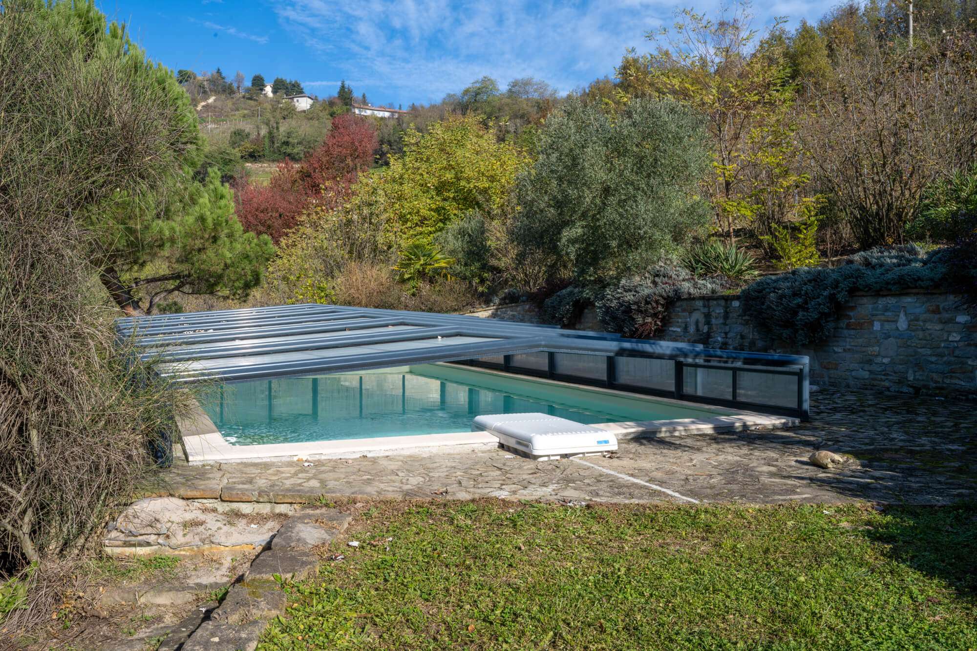There’s a covered swimming pool, outside dining and relaxing areas and large land.