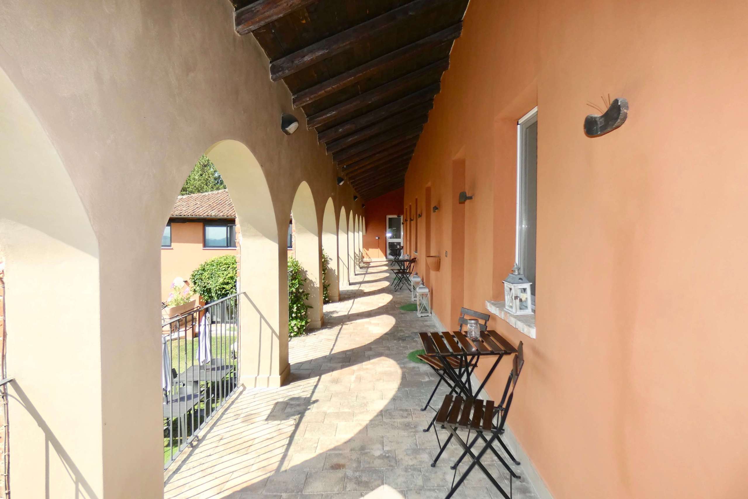 The garden, meticulously kept, leads to the rustic portico with brick arches, where the authentic soul of the property immediately reveals itself.