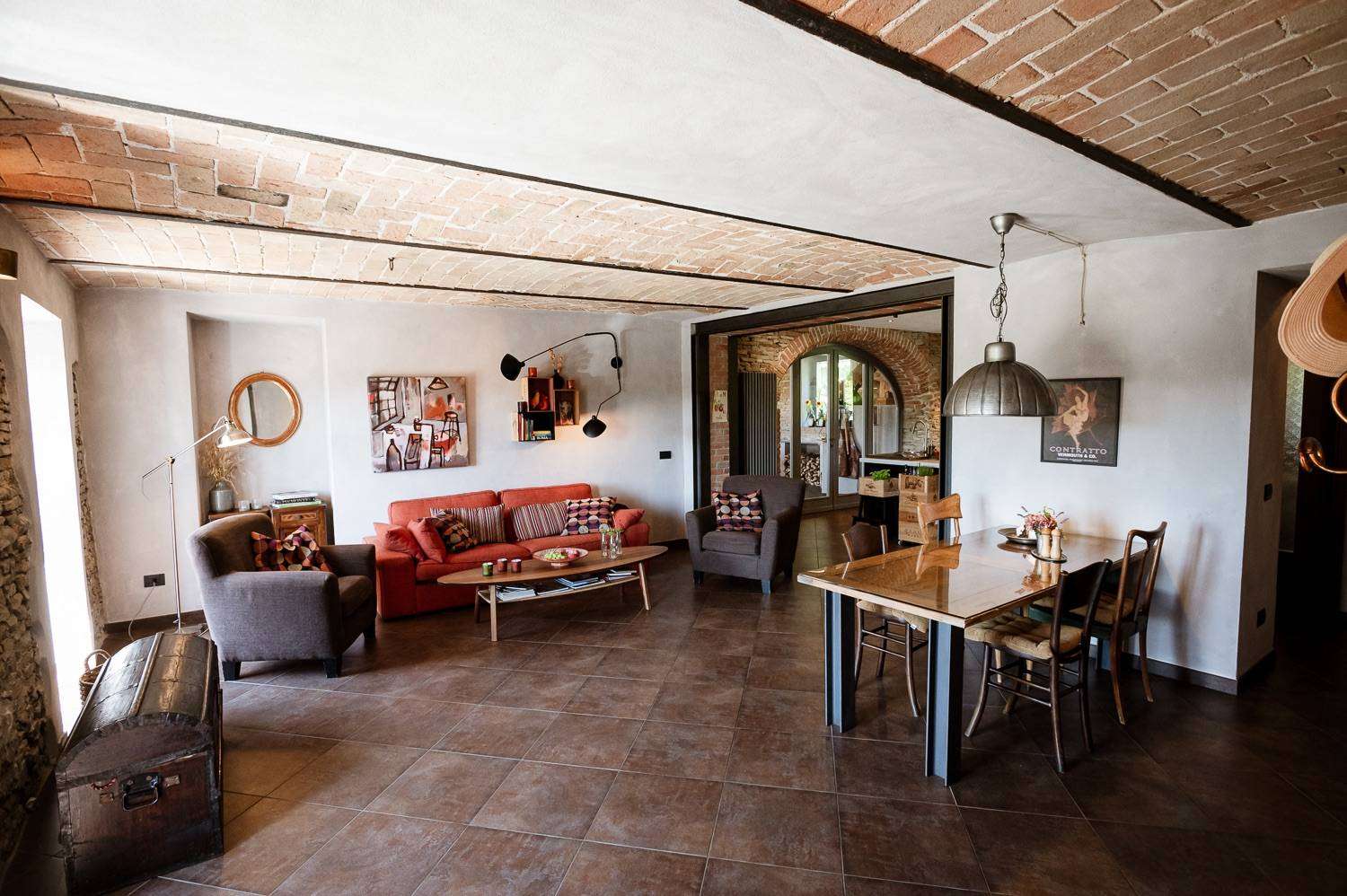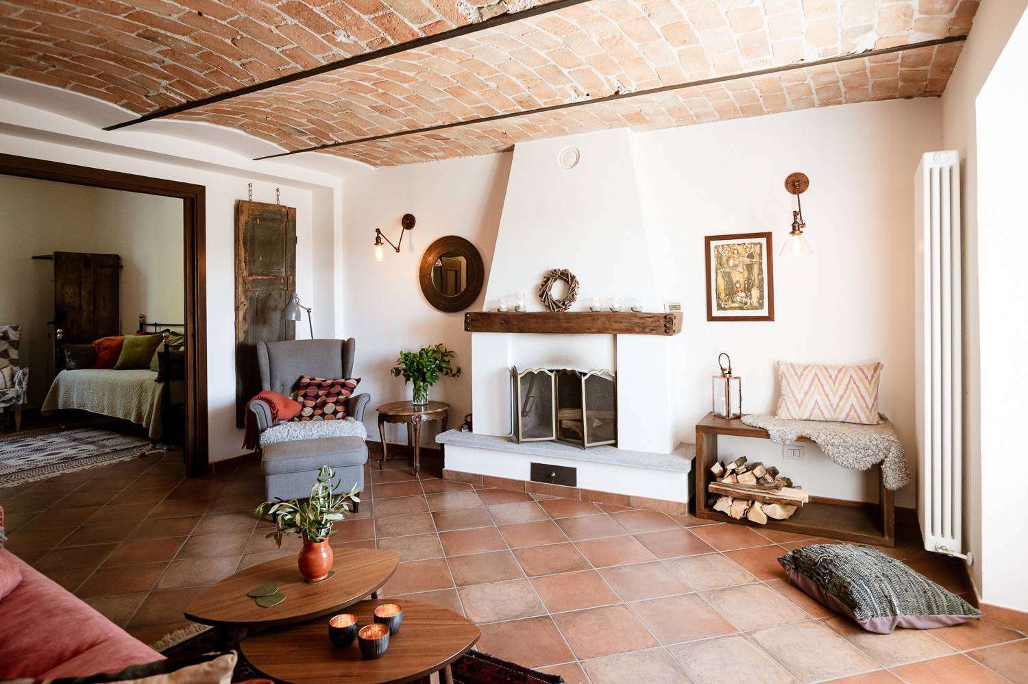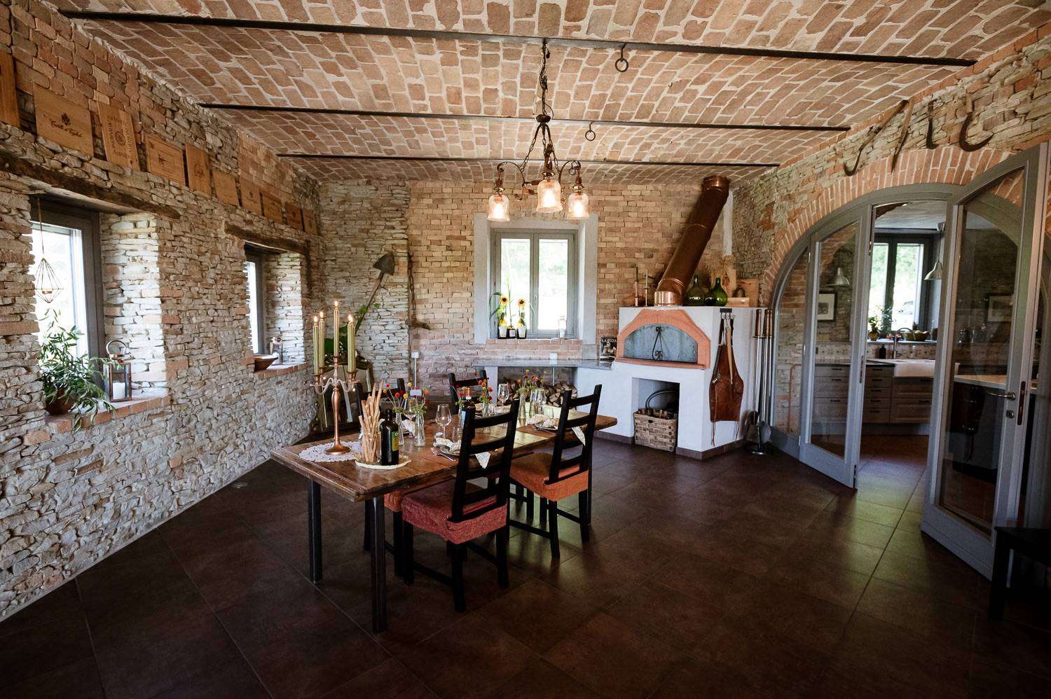 On the ground floor is a cosy open-plan area with a modern-style kitchen and dining room, two bathrooms, a combined lounge/bedroom and a cosy living room with a wood-burning fireplace that adds charm and intimacy. Also on the ground floor, the kitchen leads to a wonderful and unique room with stone walls, vaulted ceilings with exposed brickwork, a large French door with direct access to the courtyard and a wood-fired pizza oven!